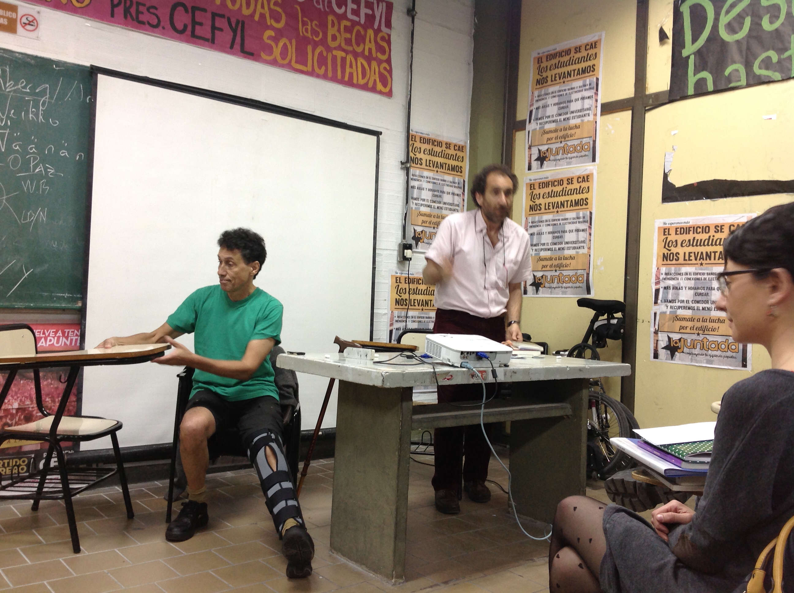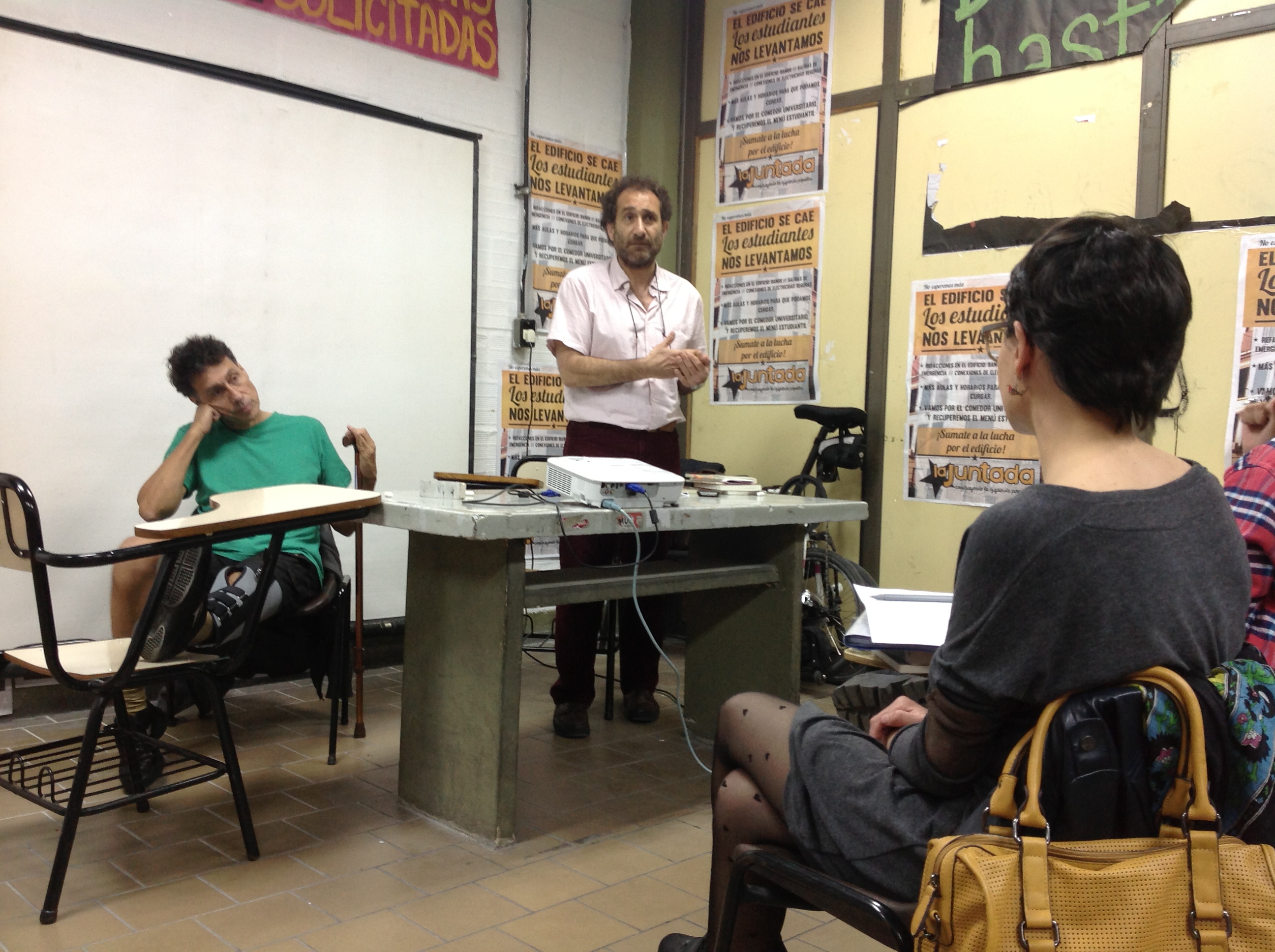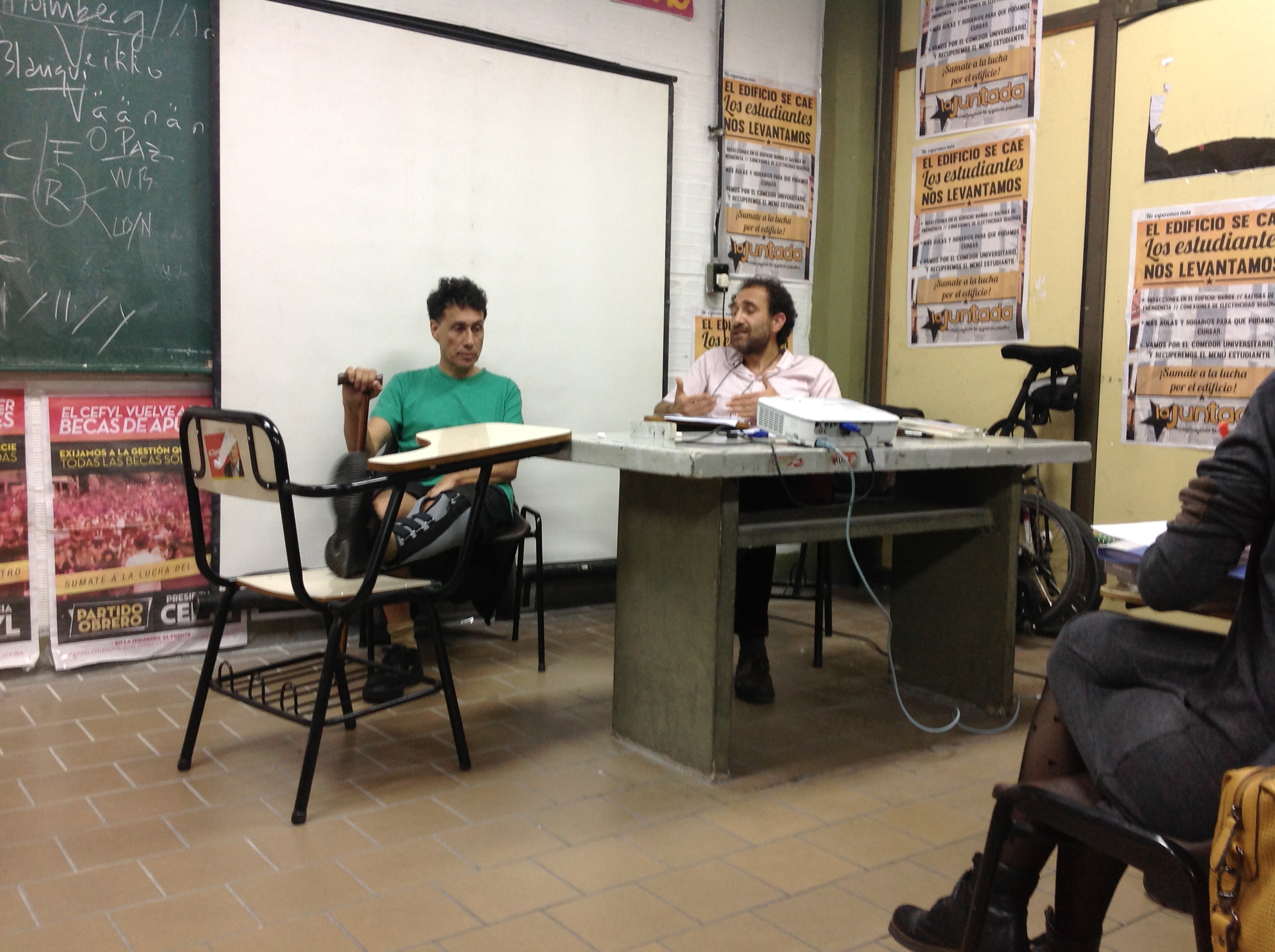 Con Miguel Vitagliano en Puán, Teoría Literaria III, en un amable encuentro con 60 estudiantes y otros miembros de la cátedra (entre ellos la encantadora Laura Estrín, y Florencia Angilletta, creo, allí en primera fila): me sentí cómodo pese a esa cara de fastidio que aquí aparece por tener que estar más de una hora con una pierna levantada y en postura corporal desajustada sobre el asiento.