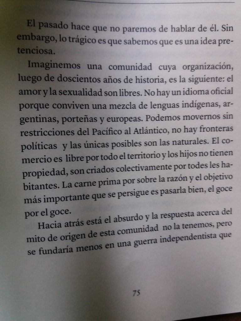 «Imaginemos una comunidad cuya organización, luego de doscientos años de historia, es la siguiente: el amor y la sexualidad son libres. No hay un idioma oficial porque conviven una mezcla de lenguas indígenas, argentinas, porteñas y europeas. Podemos movernos sin restricciones del Pacífico al Atlántico, no hay fronteras políticas y las únicas posibles son las naturales. El comercio es libre en todo el territorio y los hijos no tienen propiedad, son criados colectivamente por todes les habitantes. La carne prima sobre la razón y el objetivo más importante que se persigue es pasarla bien, el goce por el goce.