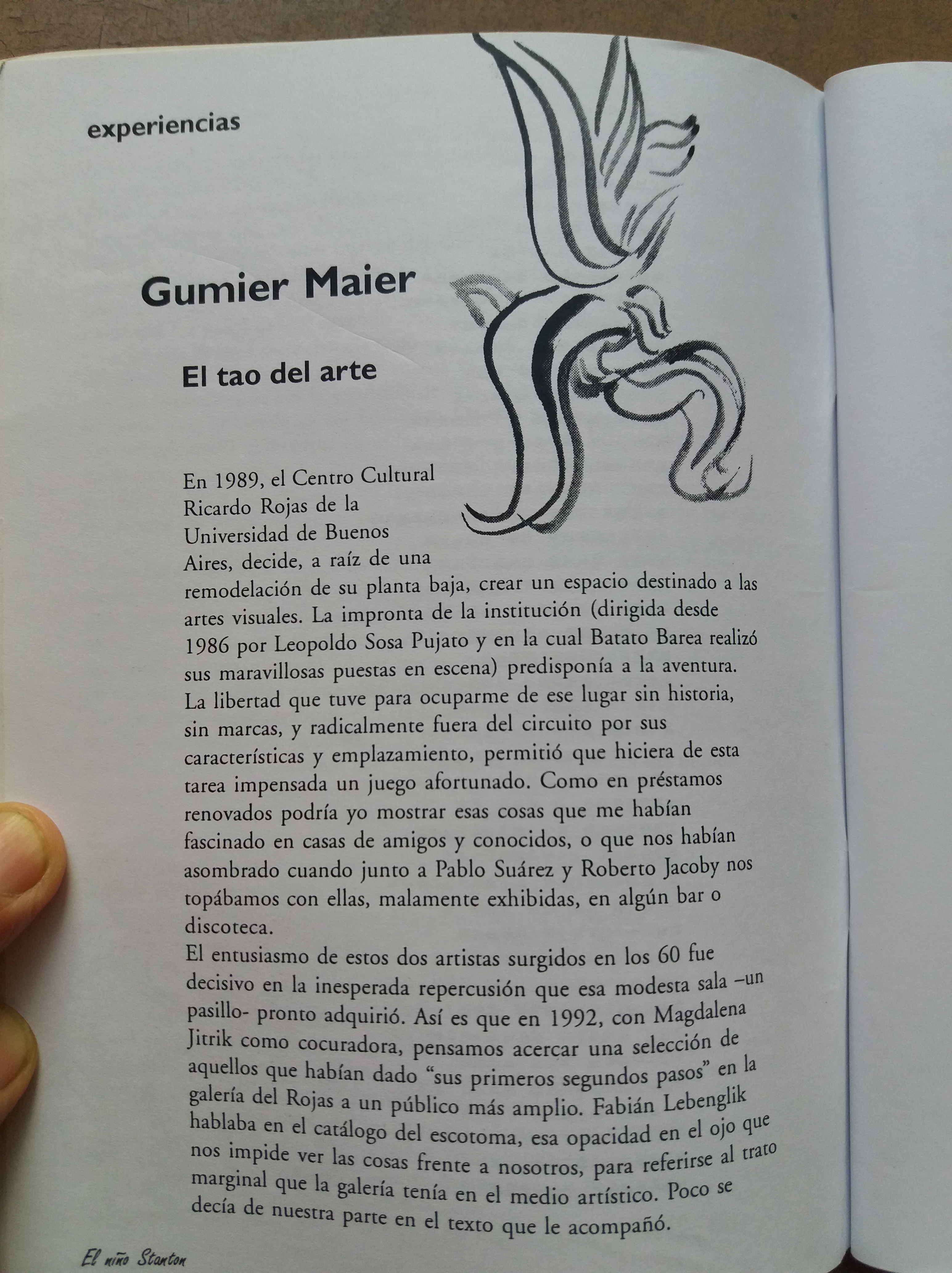 Nacido en 1953, artista visual, intelectual, curador, profesor de diseño y periodista, Gumier tuvo su primera muestra individual en el Café Einstein en 1982. Luego exhibió en el Centro Cultural Recoleta, en Espacio Giesso, en Belleza y Felicidad y en la galeria Braga Menéndez, entre otros espacios, pero se lo conoció sobre todo por su actividad como curador en la galería del Centro Cultural Ricardo Rojas desde 1989 hasta 1996 y después de nuevo en el 2003, donde puso en marcha una crítica al sistema neoconceptual y profesional del arte que en esos momentos se imponía en Argentina, proponiendo como alternativa un «modelo curatorial doméstico», de «coleccionista pobre» para rescatar artistas y materiales hasta ese momento marginalizados. Su texto «El tao del arte», reproducido en la revista El niño Stanton en junio de 2009, subrayaba que se proponía resaltar «la singularidad de estos artistas, sus procedimientos empecinados, lo poético surgiendo donde no se lo esperaba».