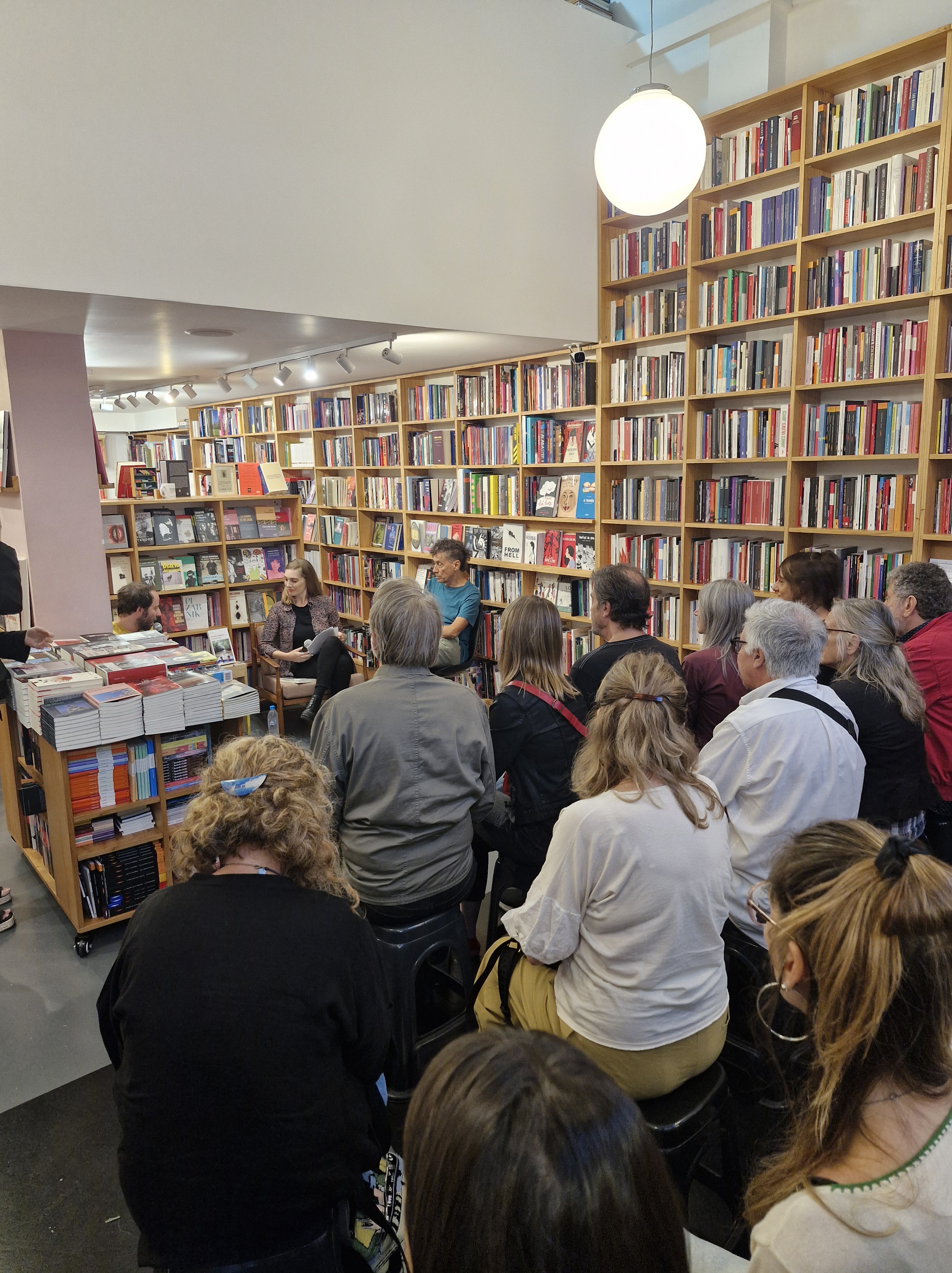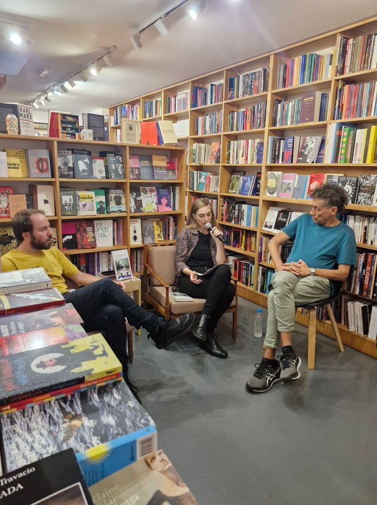 Tres instantes de la presentación de Terminal 2020 en la librería Céspedes el 25 de marzo de 2025, con Mauro Libertella y Malena Rey.