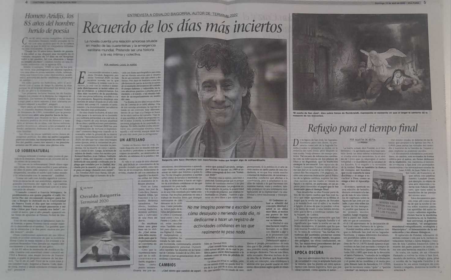 «El reconocido escritor y periodista Osvaldo Baigorria presentó Terminal 2020, su más reciente novela, en la que combina lo íntimo con lo colectivo, lo real con lo onírico e interpela directamente al lector sobre cómo se vivieron –y sobrevivieron– los días más inciertos de la pandemia» escribe Mariano Casas Di Nardo en esta nota que me hizo para el diario La Prensa. «Con una prosa reflexiva, sensible y a la vez punzante, Baigorria despliega una historia de amor situada en el año más crítico del covid-19, cuando el aislamiento y la incertidumbre sacudieron los vínculos más profundos.